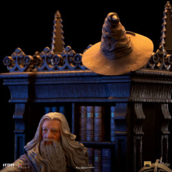 At the top of a tower, behind a door hidden by a gargoyle on the third floor of the west part of Hogwarts Castle, the wise, elder, and tall master with long hair and a long beard with its ends tied in gray color, wearing a gray tunic he points his extremely powerful Elder Wand of which he is owner and master, also known as "Wand of Destiny". In his office, at the top of small stairs formed by stone steps built at the end of the Middle Age, the Headmaster of the School of Witchcraft and Wizardry Hogwarts majestically presents himself in his statue "Dumbledore Deluxe - Harry Potter - Art Scale 1/10" by Iron Studios, fulfilling the desire of countless fans of the Harry Potter saga in the movies. Over a diorama pedestal, the Deluxe version brings many elements of the magic office of the headmaster, with a totem supporting an astronomic globe by his side, a classic carved wooden shelf on the back with part of his extensive library, and the magic Sorting Hat on top of it, and a small table with books.
