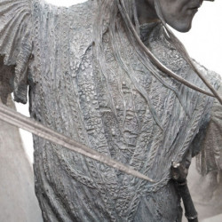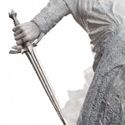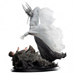 Unable to resist, Frodo thrusts the One Ring onto his finger and is plunged into the grey spirit world of Ring-sight. No longer an empty black robe, the Witch-king is revealed to Frodo in his true form, fell and terrible to behold. Beneath a bladed crown he glows with an unearthly light. a tall white being of ghostly skin drawn about sunken features, wispy hair whipped by an ethereal tempest, and a long, jagged blade in his luminous hand as he reaches for the Ring.