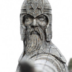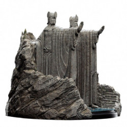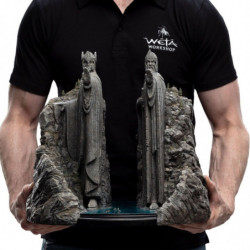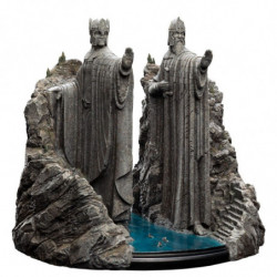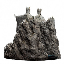 Rounding a bend in the river all eyes rise to behold a spectacle seen by few, the mighty Argonath: The Pillars of the Kings. With feet planted as if gliding upon the water, two great statues rise far above with arms raised in challenge and weapons clutched tight to their chests. Crowns adorn their great grey heads while stone eyes gaze north in ceaseless vigilance. Hewn by many hands from living rock, the Argonath are carved in the likeness of the kings of old, Aragorn's kin. In centuries past they guarded the boundary of ancient Gondor, standing immovable against the foes of Númenor. projections of the power and majesty of a people now all but gone.