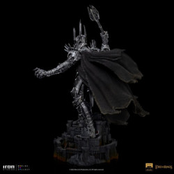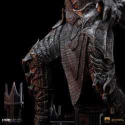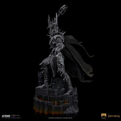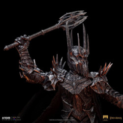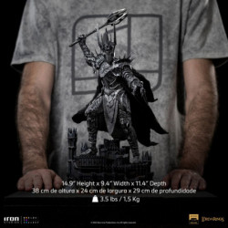 Wielding a giant iron war mace with six blades on top of his head, capable of killing dozens of men with only one strike, the fearsome Dark Lord reveals himself as if he was in the battleground. Wearing darkened steel armor similar to his old master Morgoth, worn to bind his spirit to his body, with his back covered by a rustic black cape and his face hidden by a sinister helmet with a crown of blades over his head. His imposing figure stands out on a diorama pedestal that replicates in detail his stronghold called Barad-dûr in Mordor, Middle-earth, his base of operations during the 2nd Age and the end of the 3rd Age. An entity whose mere presence causes fear in the heart of the bravest, Iron Studios bring the statue "Sauron Deluxe - The Lord of the Rings - Art Scale 1/10" with the main and most feared antagonist in the saga created by J.R.R. Tolkien, such as seen in the movie trilogy by director Peter Jackson.