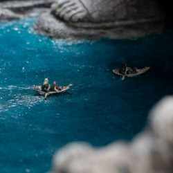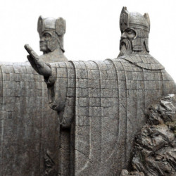 Rounding a bend in the river all eyes rise to behold a spectacle seen by few, the mighty Argonath: The Pillars of the Kings. With feet planted as if gliding upon the water, two great statues rise far above with arms raised in challenge and weapons clutched tight to their chests. Crowns adorn their great grey heads while stone eyes gaze north in ceaseless vigilance. Hewn by many hands from living rock, the Argonath are carved in the likeness of the kings of old, Aragorn's kin. In centuries past they guarded the boundary of ancient Gondor, standing immovable against the foes of Númenor. projections of the power and majesty of a people now all but gone.