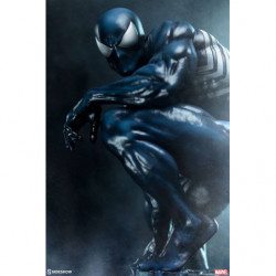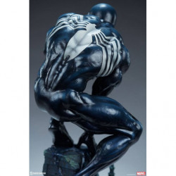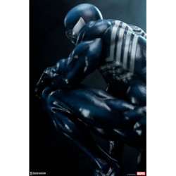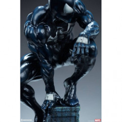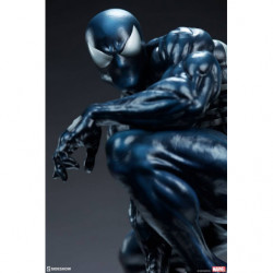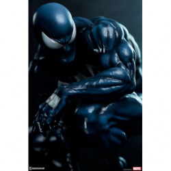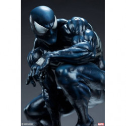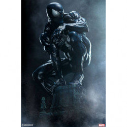 Inspired by a classic comic book storyline, the polyresin Symbiote Spider-Man Premium Format&trade. Figure features a fully sculpted rendition of the infamous black costume over our hero's athletic physique. His suit features a white raised spider-symbol on his chest and back, white web shooters on the back of each hand, and large white eyes on his masked face. The dark symbiote is sculpted with varied textures that mimic the movement of this alien entity as it bonds to Spider-Man. Peter Parker takes on a darker persona wearing this unique symbiote suit, reflected in his posture and stern gaze at the city below.