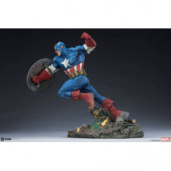 The Captain America Premium Format Figure is fully sculpted to capture the Star-Spangled Avenger's classic comic book appearance in a three-dimensional collectible format. Cap's costume consists of his classic red, white, and blue bodysuit with a scale-covered chest emblazoned with his star symbol on the front and back, as well as red gloves and boots all textured with realistic fabric-like looks. He leads with his shield, weathered with wartime distress and orange blast effects on the front. Finally, Captain America's classic cowl features a large letter "A" and a pair of white wings framing his resolved portrait, determined to do whatever it takes to stand up for freedom and justice.