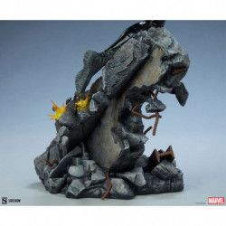 The Black Widow Premium Format Figure measures 23" tall as Natasha Romanoff slides down the wall of a secret Hydra facility base, dodging orange bursts of enemy fire since stealth is no longer an option. Her signature red hair flows dramatically as she makes a daring escape through rocky debris, firing off blue electroshock blasts from her Widow's Bite bracelets. Hydra won't know what hit them!