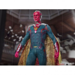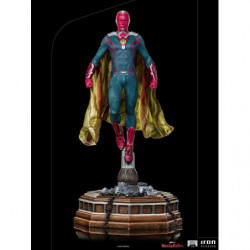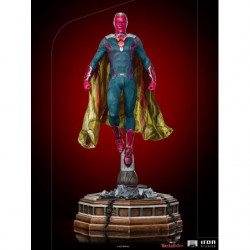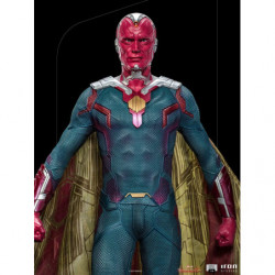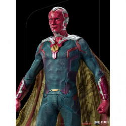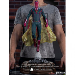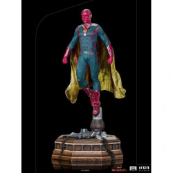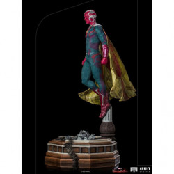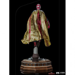 Above the destroyed remains of a library pillar located in the town of Westview is the synthezoid avenger, an artificially created humanoid being. After being revived by his beloved sorceress wife, through the Magic of Chaos, he rises, floating, with clenched fists and a grim countenance, ready to combat any threat to his family, even though he is a ghostly version of his reassembled body, without his memories and his love for Wanda Maximoff. Inspired by the latest episode of the Disney+ streaming TV series Wandavision, Iron Studios presents the "Vision - Wandavision - Legacy Replica 1:4 Statue", where the hero faced himself in defense of his beloved wife and children.