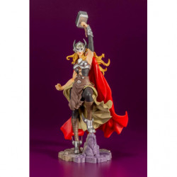 Her muscular figure strengthened by the power of Mjolnir, silver helmet and armor, and fluttering cape give the statue the elegance of a refined Asgardian.
