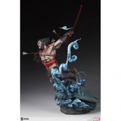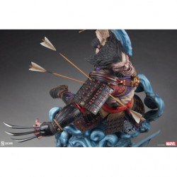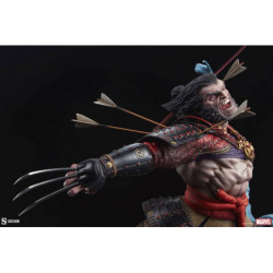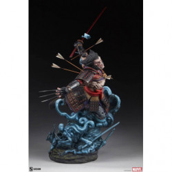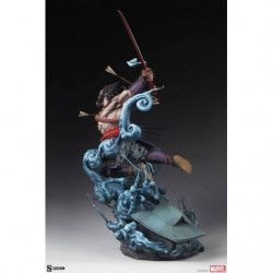 The Wolverine: Ronin Premium Format Figure features a mixed media costume application, consisting of patterned fabric pants and a red fabric belt paired with colorful sculpted samurai armor. The wandering swordsman has been struck by numerous arrows lodged in his arms as he slashes apart his foes. From the topknot on his portrait to the woven bottoms of his boots, this ornate, ornery hero makes a uniquely detailed addition to any X-Men statue display.
