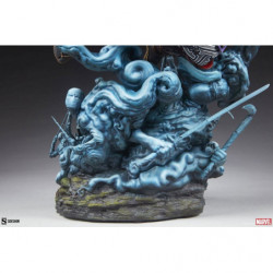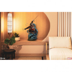 The Wolverine: Ronin Premium Format Figure measures 24.25" tall and 17.3" wide as Logan cuts a furious swathe through a cloud of clandestine spirit warriors. Their ghostly blue forms curl all around him in a unique forced perspective base that features a traditional Japanese temple backdrop. Wolverine wields the legendary Muramasa Blade in one hand, unsheathing his Adamantium claws with the other hand.