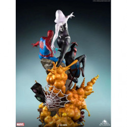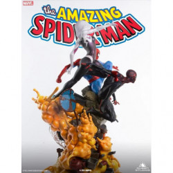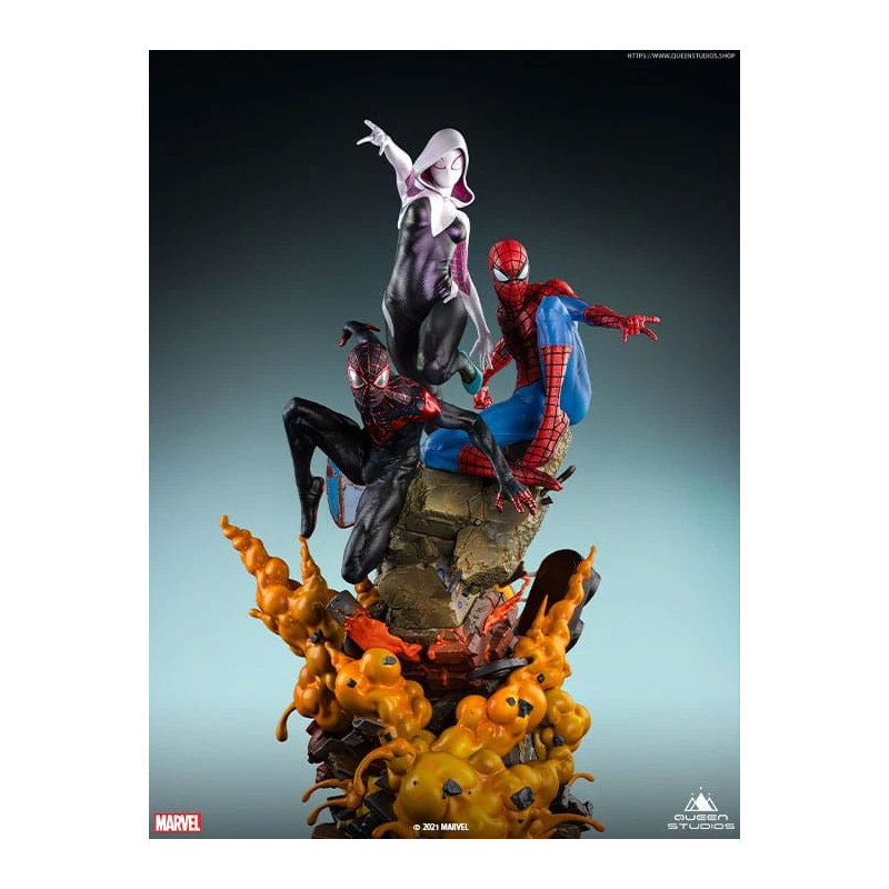 The Amazing Spider-Man Spider-Verse Trio statue by Queen Studios is inspired by the cover of Amazing Spider-Man Volume 3: Spider-Verse. To recapture this iconic cover, the 1/4 scale statue includes a trio of heroes as they propel over an exploding base. As always, this limited edition collectible is packed full of intricate details. From the contours in each suit, to the projectiles in the base. Our artists have done their best to bring the characters to life for your collection.