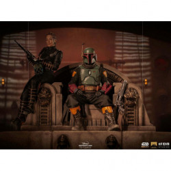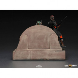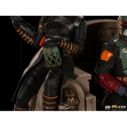 The bounty hunter sits on a throne decorated with monstrous bronze heads, which meticulously replicates the minimum details of the post-credits scene from Season 2 of the series "The Mandalorian". Thus Iron Studios presents its statue "Boba Fett and Fennec Shand on Throne Art Scale 1/10 Deluxe - The Mandalorian - Iron Studios". This statue features the iconic Star Wars mercenary in his restored Mandalorian armor, with his classic blaster rifle resting on the left arm of the concrete throne, and also features his lethal ally sitting on the right arm of the throne, holding her blaster rifle. The statue faithfully reproduces the features of the Chinese-American actress Ming-Na Wen who plays Fennec. The scene is a preview of "The Book of Boba Fett," another Star Wars spin-off series scheduled for late 2021.