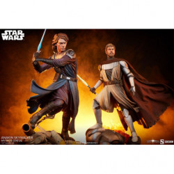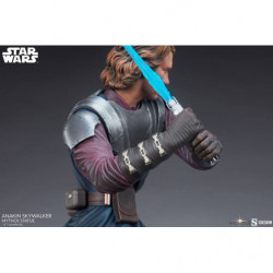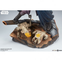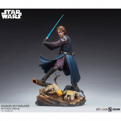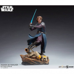 The Anakin Skywalker Mythos Statue measures 21" tall as the Jedi Knight cuts through an infantry of B1 and B2 battle droids during the Clone Wars conflict. Wielding his blue lightsaber blade, Anakin is a fierce and often overconfident fighter, but is nonetheless a peacekeeper aligned with the noble goals of the Jedi Order.